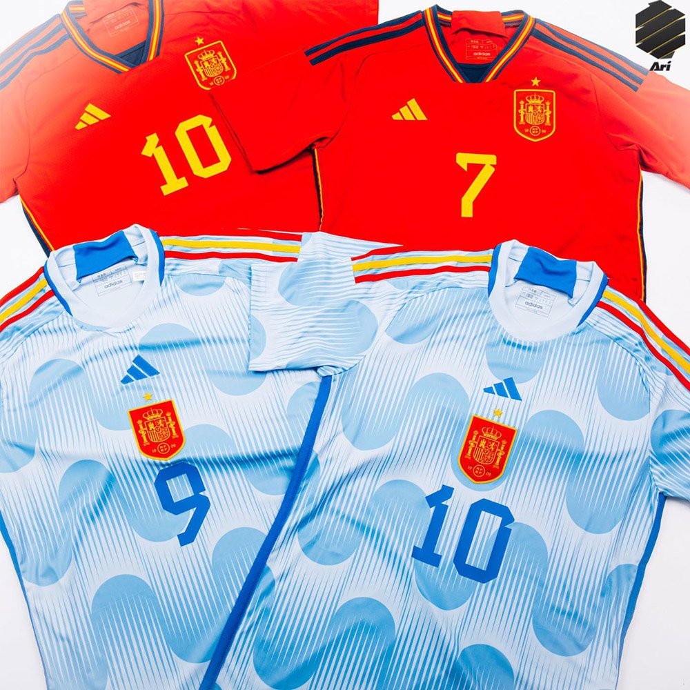 Spain's home kits express Spain's unique playing styles, with an eye-catching dark red color and the Spanish flag's color stripes on the collar and the sides.