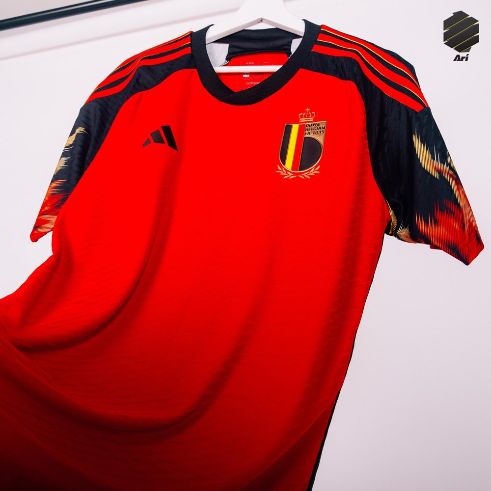 The Belgium home kits are predominantly fiery red, adorn with black and yellow detailing, which are the colors of the Belgian flag. Flames running up the arms to represent the devil to match Belgium's moniker, the Red Devils of Europe, as a stratagem to discourage their opponents.