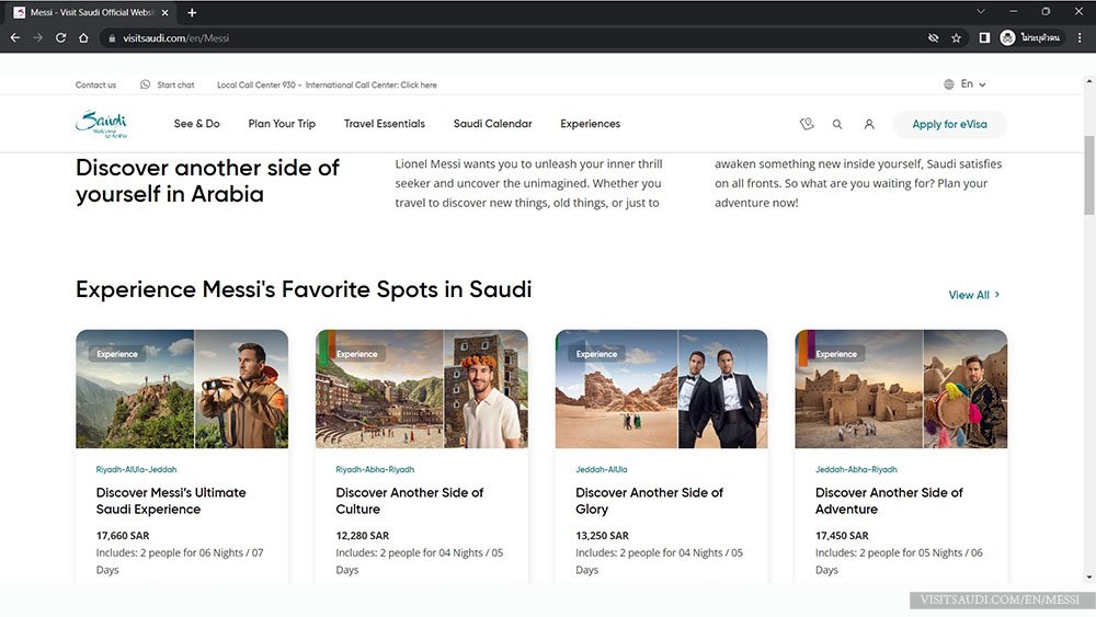 ปัจจุบัน เว็บไซต์ Visit Saudi มีหน้า Landing Page หรือหน้าเว็บไซต์ที่ถูกสร้างขึ้นโดยมีจุดประสงค์ที่เฉพาะเจาะจงที่จะสื่อสารกับคนเข้ามาดูเว็บไซต์โดยมี ลิโอเนล เมสซี่ เป็นผู้โปรโมตหลัก www.visitsaudi.com/en/Messi โดยมุ่งเป้าหมายเชิญชวนให้นักท่องเที่ยวมาร่วมสัมผัสประสบการณ์ใหม่ ๆ ในการท่องเที่ยวซาอุดีอาระเบีย มีทั้งแพ็คเกจท่องเที่ยว ข้อความพร้อมภาพถ่ายแนะนำสถานที่ท่องเที่ยวสำคัญของประเทศอย่างครบครัน