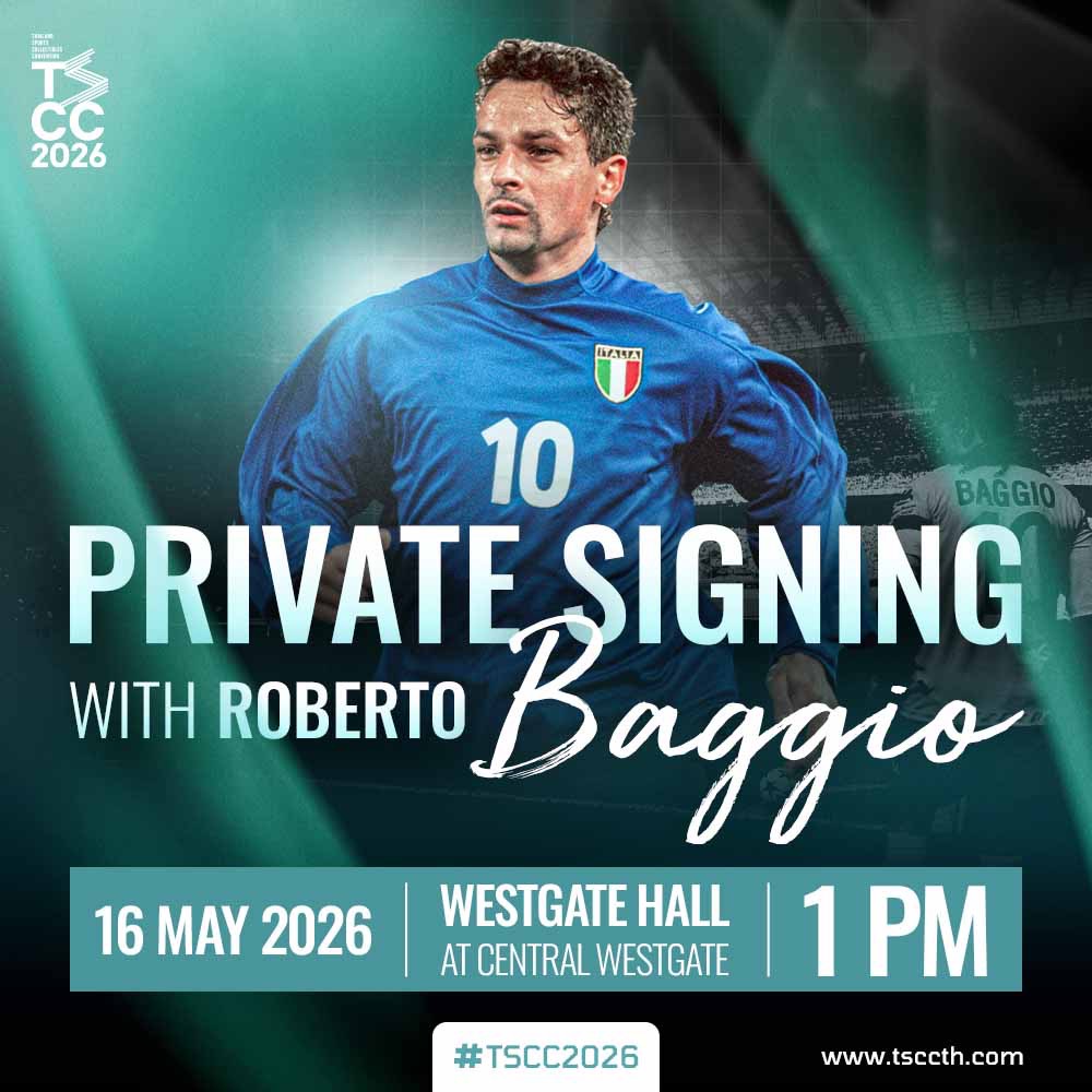 กรุงเทพฯ — ประกาศแล้ว! ไฮไลท์สุดพิเศษของงาน Thailand Sports Collectibles Convention 2026 (TSCC'26) ที่จะจัดขึ้น 2 วันเต็ม ในวันที่ 16-17 พฤษภาคม 2569 กับโอกาสหาได้ยากที่จะพบตำนานฟุตบอลระดับโลก "เทพบุตรเปียทองคำ" โรแบร์โต้ บาจโจ้ ผู้คว้ารางวัล Ballon d'Or ปี 1993 ในการมาเยือนเมืองไทยอย่างเป็นทางการครั้งแรกในรอบ 30 ปี พร้อมกิจกรรม Meet and Greet สุดพิเศษที่จะมีแฟนบอลเพียง 250 คนเท่านั้นที่จะได้ถ่ายภาพ 1:1 และรับลายเซ็นบนผลงานศิลปะสุดเอกซ์คลูซีฟ ภายในงานนี้เท่านั้น