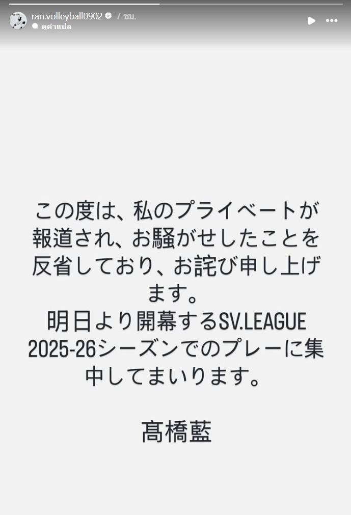 "ผมรู้สึกเสียใจที่ชีวิตส่วนตัวของผมถูกนำไปรายงานในสื่อ จนเกิดความวุ่นวาย ผมอยากขอโทษ และขอมุ่งสมาธิให้กับการแข่งขัน SV.League ฤดูกาล 2025-26 ที่จเริ่มขึ้นในวันพรุ่งนี้ครับ" ทากาฮาชิ ระบุ